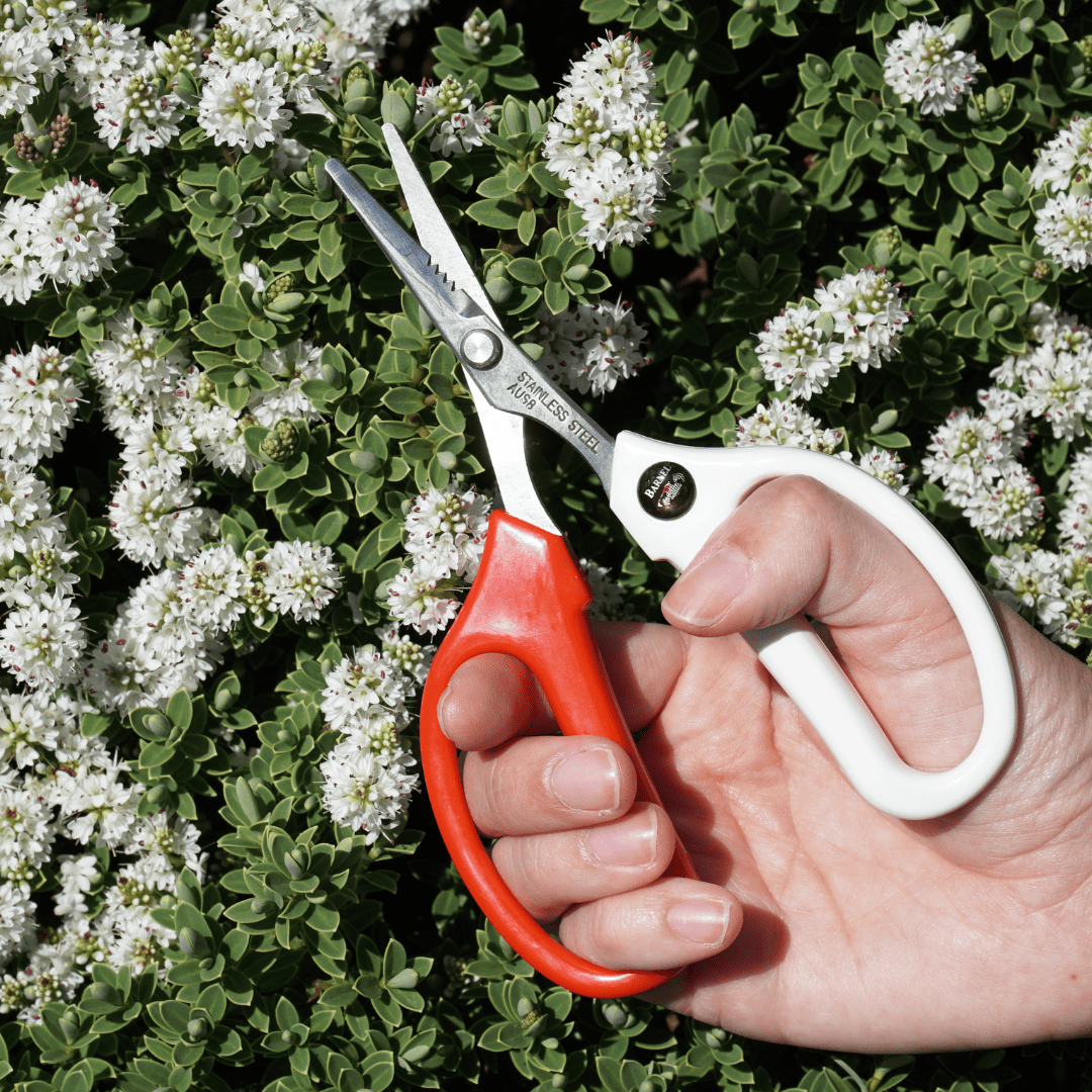 Para uso en vides, flores y plantas bonsái. Cuchillas de acero inoxidable endurecido AUS8, Asas gelificadas suaves, Secciones de hoja dentada y Hoja recta