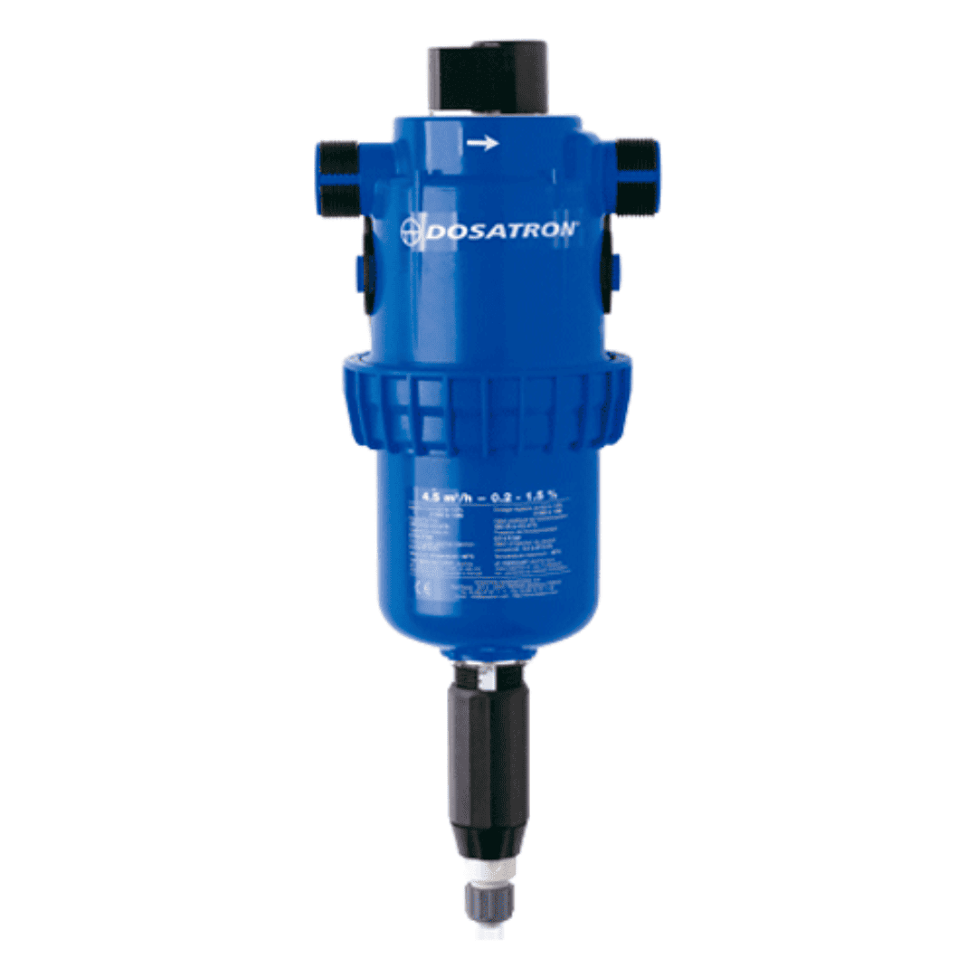 La gama de dosificadores D45 satisface las necesidades de dosificación para caudales de 100 a 4.500 l/h. Se caracteriza por: Dosificación proporcional y sin electricidad, proporcionalidad dependiente del caudal de agua e inyección de salida.